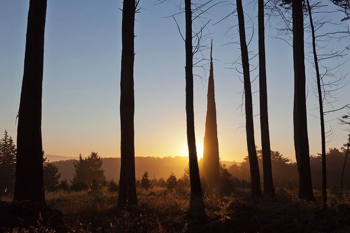Andy Goldsworthy’s towering sculpture Spire (2008) is constructed from the trunks of 37 Monterey cypress trees felled as part of the Presidio’s reforestation effort. Inspired by the form of church bell towers but rooted in the earth, the artwork evokes the layering of natural and human history in the Presidio’s forest, which was planted by the US military in the late 19th and early 20th centuries.